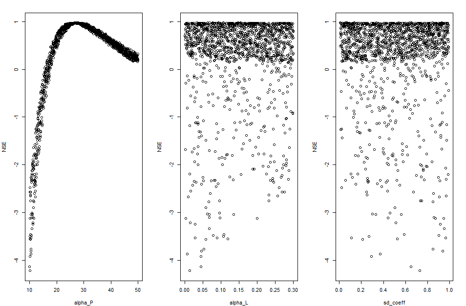 DF_calib_TN <- calib_green(catch_data_TN, annual_data_TN, n_iter, low, upp, years)The calibration function applies a Latin Hypercube sampling scheme to the three parameters within the possible range (defined by lower and upper limits) and evaluates model performance (predictions against available observations) for the calibration period (specified in years) by calculating several “goodness-of-fit” metrics. The function returns a data frame with parameters and goodness-of-fit scores that can be further analyzed.