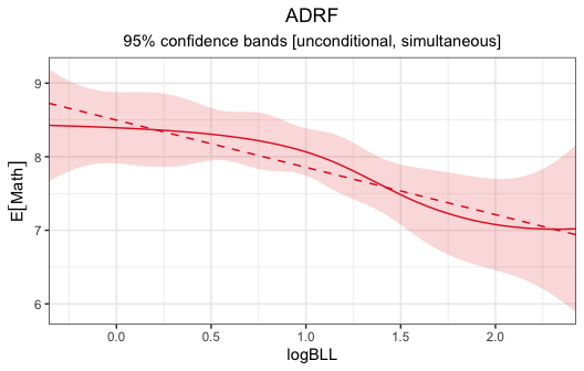 There is some relationship between logBLL and Math adjusting for the included potential confounders, based on rejection of the hypothesis that the ADRF is flat for logBLL values between -0.3567 and 2.4248 (p < .0001). There isn’t evidence that the ADRF is nonlinear within this range (p = .3153). The linear projection has a coefficient of -.643 (p < .0001), indicating that the expected potential outcome of Math decreases by this amount for each unit increase in logBLL.