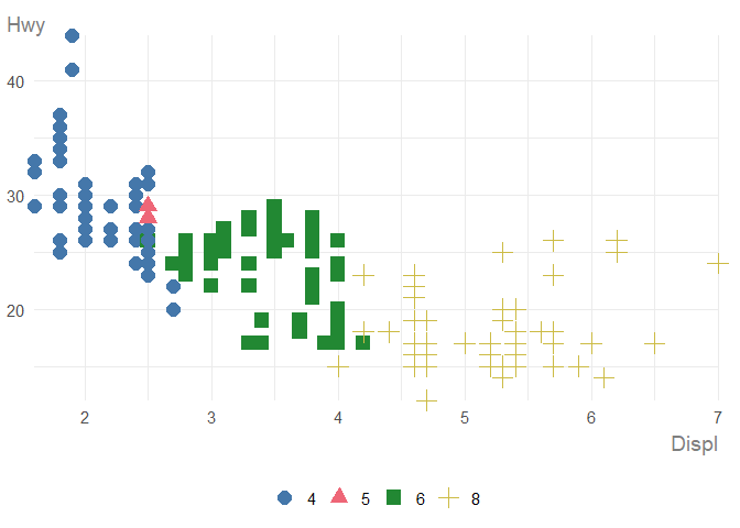 | Continuous | Continuous | Discrete | Scatter plot with coloured shapes | Yes |